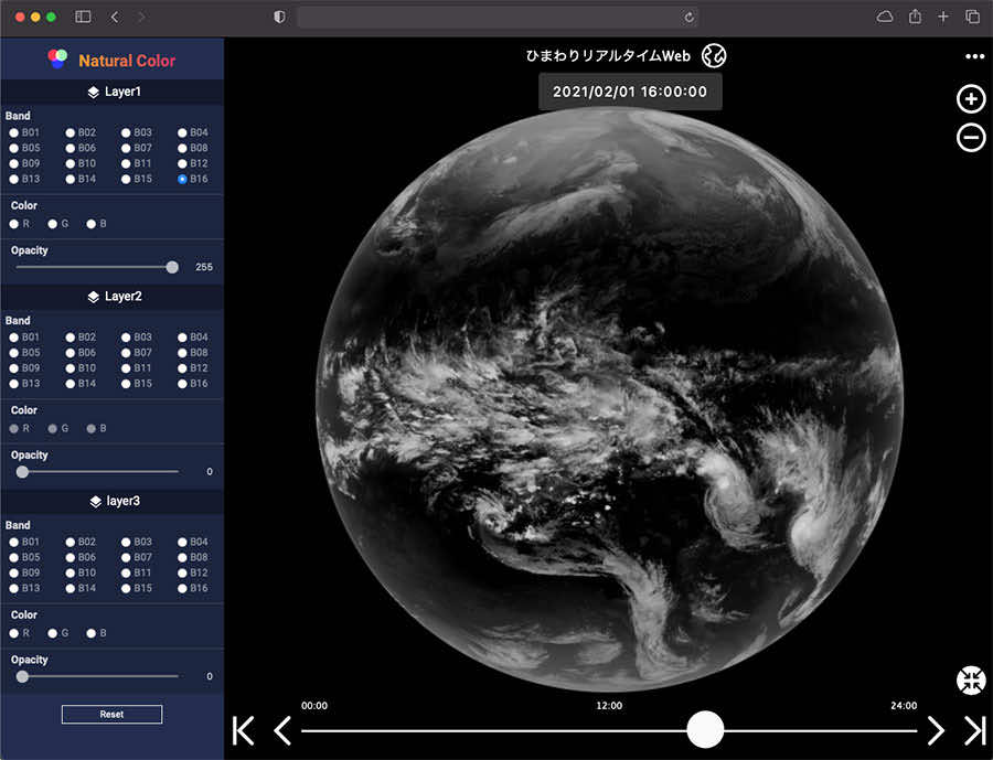 ひまわり衛星データの16バンドより、任意の3バンドを選択します。